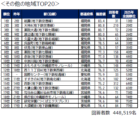 ●その他の地域は、1位祇園、2位天神A(天神・天神南・西鉄福岡の近隣駅を統合)、3位薬院大通で、トップ3は全て福岡県の駅となっています。トップ20の地域別では福岡県が最も多く10駅、次いで愛知県が4駅ランクインしています。また、北海道、宮城県、茨城県、沖縄県の駅もランクインしています。