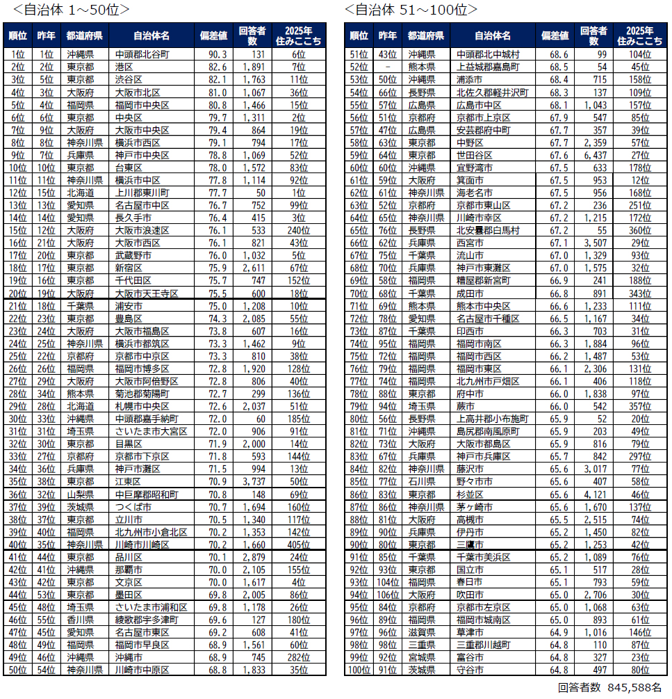 ※表内に記載している「住みここち」は、2025年8月6日に発表している「住みここちランキング<全国版>」の順位を記載しています。詳しい順位はWEBサイトをご参照ください。