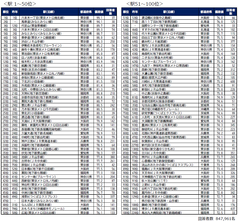 ●首都圏1都3県は、1位は3年連続で、1位は六本木一丁目(東京都)です。2位は初登場の馬車道(神奈川県)で、昨年は累計回答者数が30名未満でランキングの集計対象外でした。3位は代官山(東京都)で、昨年12位から順位を上げました。トップ2の駅は、偏差値90台の極めて高い評価を得ています。