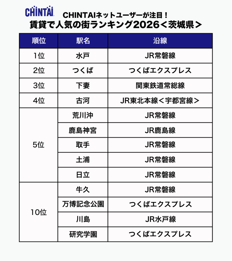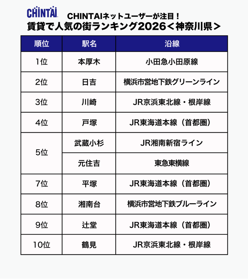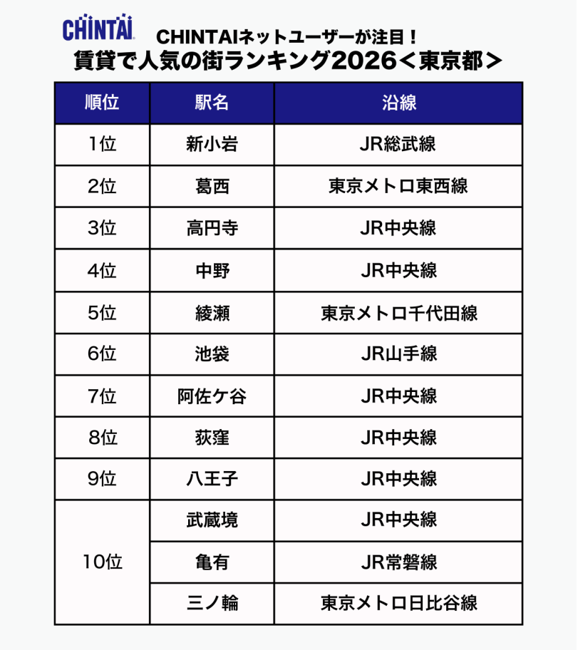 お部屋探しのリーディングカンパニー株式会社CHINTAI(本社:東京都港区 代表取締役社長 奥田倫也、以下CHINTAI)は、賃貸物件検索サイト『CHINTAI ネット』に掲載された首都圏の賃貸物件のうち、お問合せの多かった駅を集計しランキング化した「CHINTAI ネットユーザーが注目!賃貸で人気の街ランキング 2026」首都圏版を発表します。