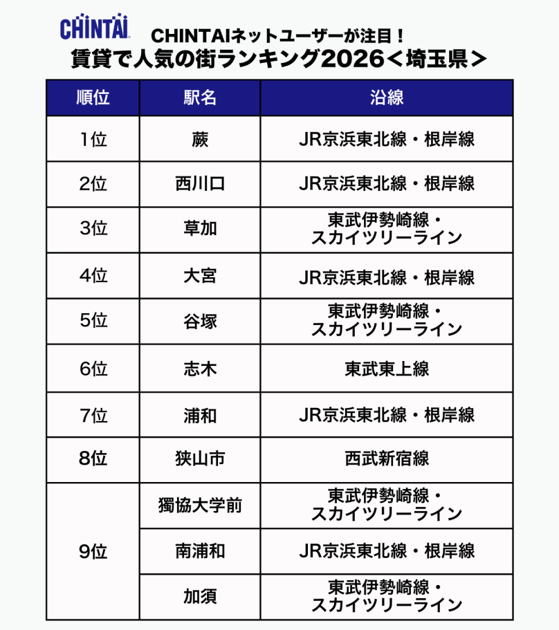 ・埼玉県では、JR京浜東北線沿線の「蕨」「西川口」をはじめ、東武伊勢崎線沿線の「草加」など、都内通勤を見据えたエリアが上位を占めました。