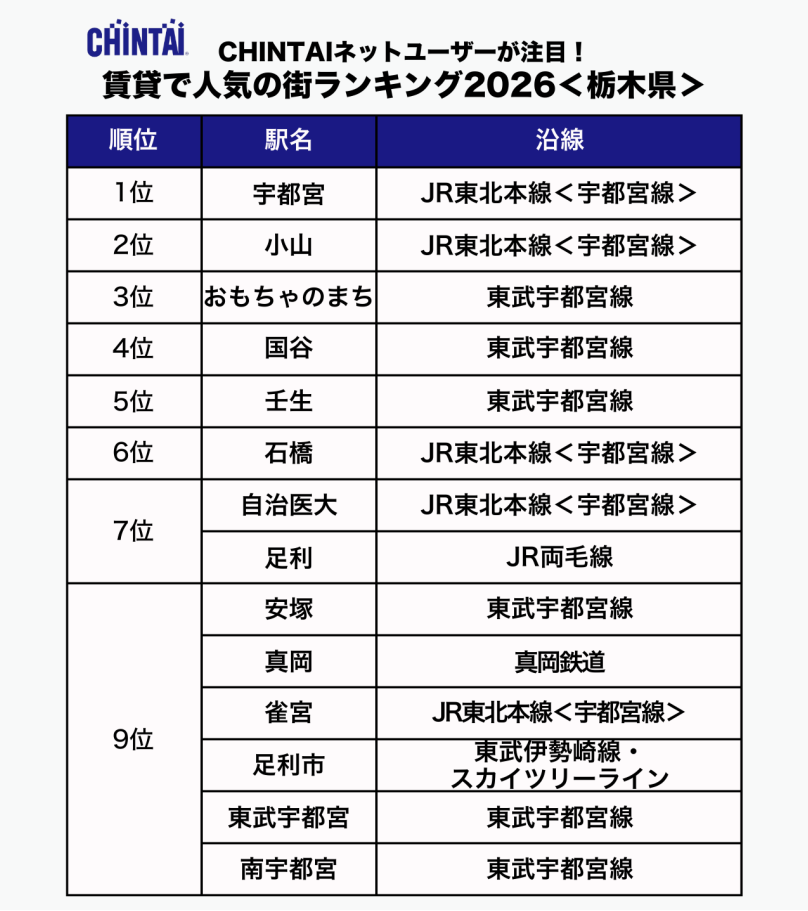 ・栃木県は、「宇都宮」や「小山」といった主要都市の駅を中心にランクインし、県内の生活拠点となるエリアへの関心の高さがうかがえます。