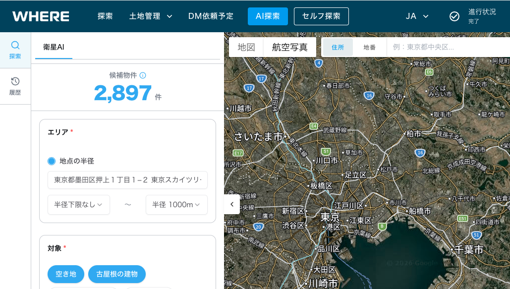 地権者とつながる不動産AIツール『WHERE』、全国の衛星データと不動産情報約7,300万件をデータベース化。条件に合う候補物件数を最短1秒で可視化