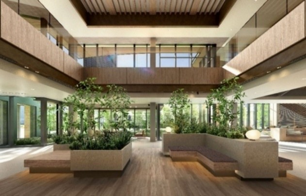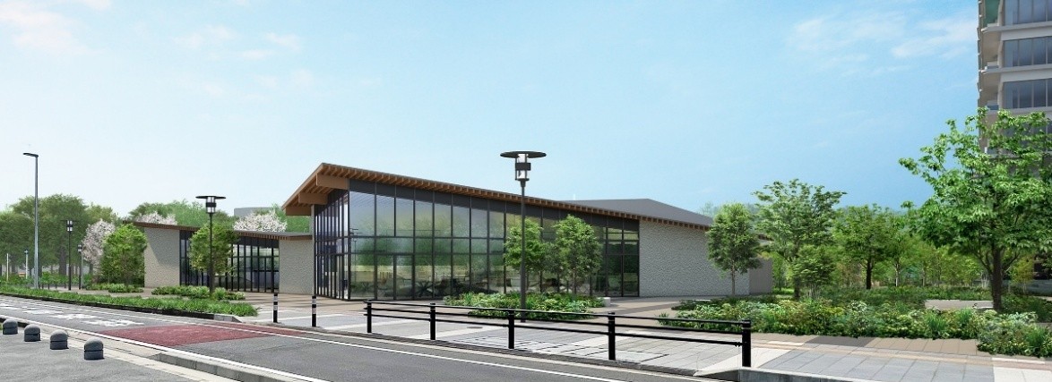 ※掲載の各完成予想CGは計画段階の図面を基に描き起こしたものおよび周辺環境写真等を合成したもので、建物の形状・色等は実際とは異なります。なお形状の細部、設備機器等は表現しておりません。表現されている植栽は初期の育成期間を経た状態のものを想定して描いており、竣工時は植物の育成を見込んで必要な間隔をとって植えております。施工上の都合により、設定位置・樹高・本数等変更となる場合があります。