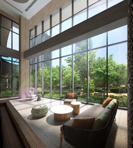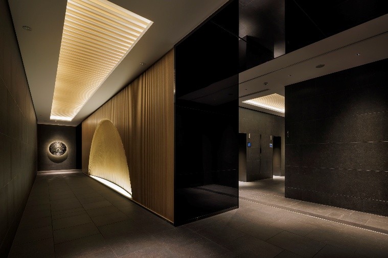 1階共用部デザインは「ザ・ペニンシュラ東京」や「コンラッド大阪」の内装デザインを手掛けた橋本夕紀夫デザインスタジオを起用。グランドエントランスから続く「ウェルカムラウンジ」では、自然から生まれる心地よい「ゆらぎ」や、美しい「きらめき」をデザインで表現しています。壁面には、日本を代表する左官職人として国内外で活躍する久住有生氏が、水面のゆらぎを繊細かつ大胆に表現した土壁を採用し、居住者を迎え入れます。ラウンジ空間の先にあるエレベーターホールは月明かりに照らされて静かに立ち並ぶ木立と月夜に浮かぶ水面を想起させる、穏やかで落ち着く空間となっております。