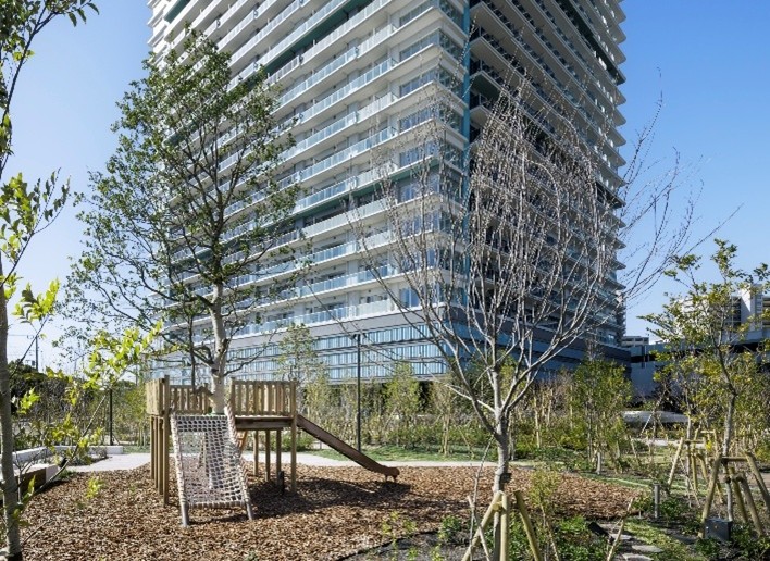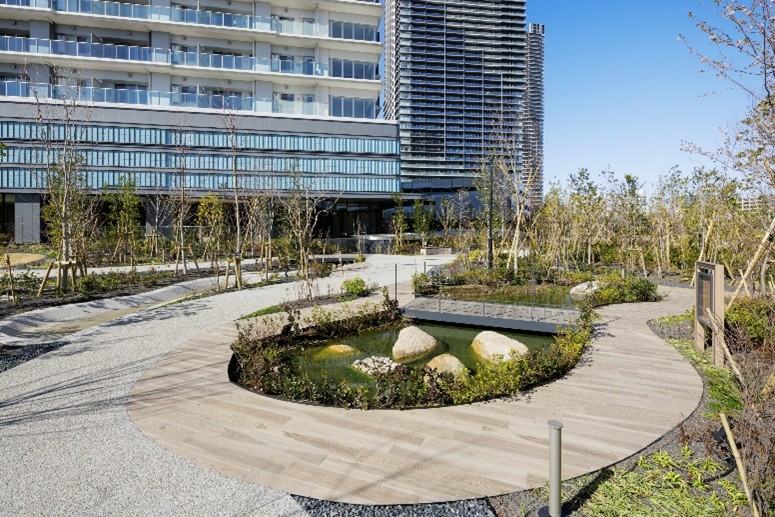 外構は「里街(さとまち)」をコンセプトに、子供から大人まで集えるシンボルツリーとツリーデッキ、生き物の生態系を学べるビオガーデン等を設け、入居後には居住者向けに植物観察会や巣箱づくり等のイベントを計画しています。本物件では敷地内における生物多様性保全の取り組みが評価され、「いきもの共生事業所Ⓡ認証(ABINC認証)」を取得しています。