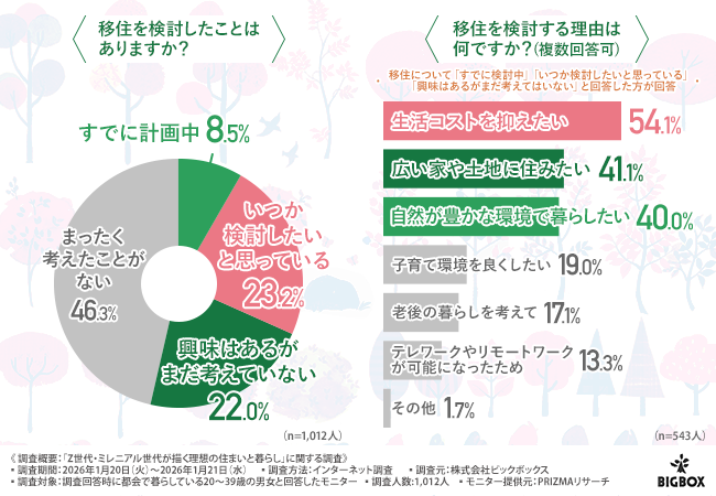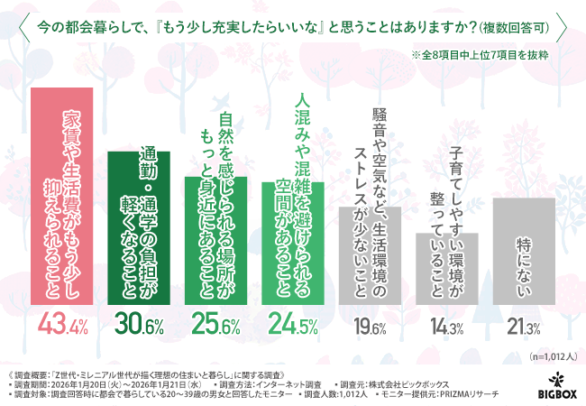 株式会社ビックボックス(所在地:栃木県宇都宮市、代表取締役:手塚 大介)は、都会で暮らしている20〜39歳の男女を対象に、「Z世代・ミレニアル世代が描く理想の住まいと暮らし」に関する調査を行いました。
