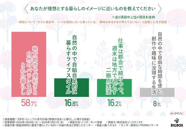 「あなたが理想とする暮らしのイメージに近いもの」について尋ねたところ、『地方都市で便利さと自然のバランスがとれた暮らし(58.7%)』と回答した方が最も多く、『自然の中で自給自足的に暮らすライフスタイル(16.8%)』『仕事は都会で続けつつ、週末は地方で過ごす二拠点生活(16.2%)』となりました。