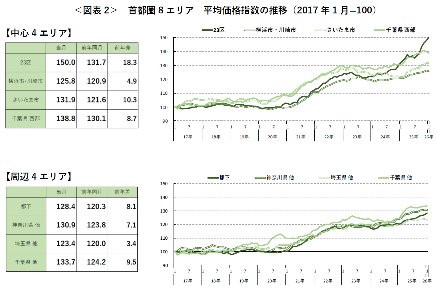 なお、東京都(23区/都下)、さいたま市、千葉県他の4エリアは2017年1月以降最高額を更新した。