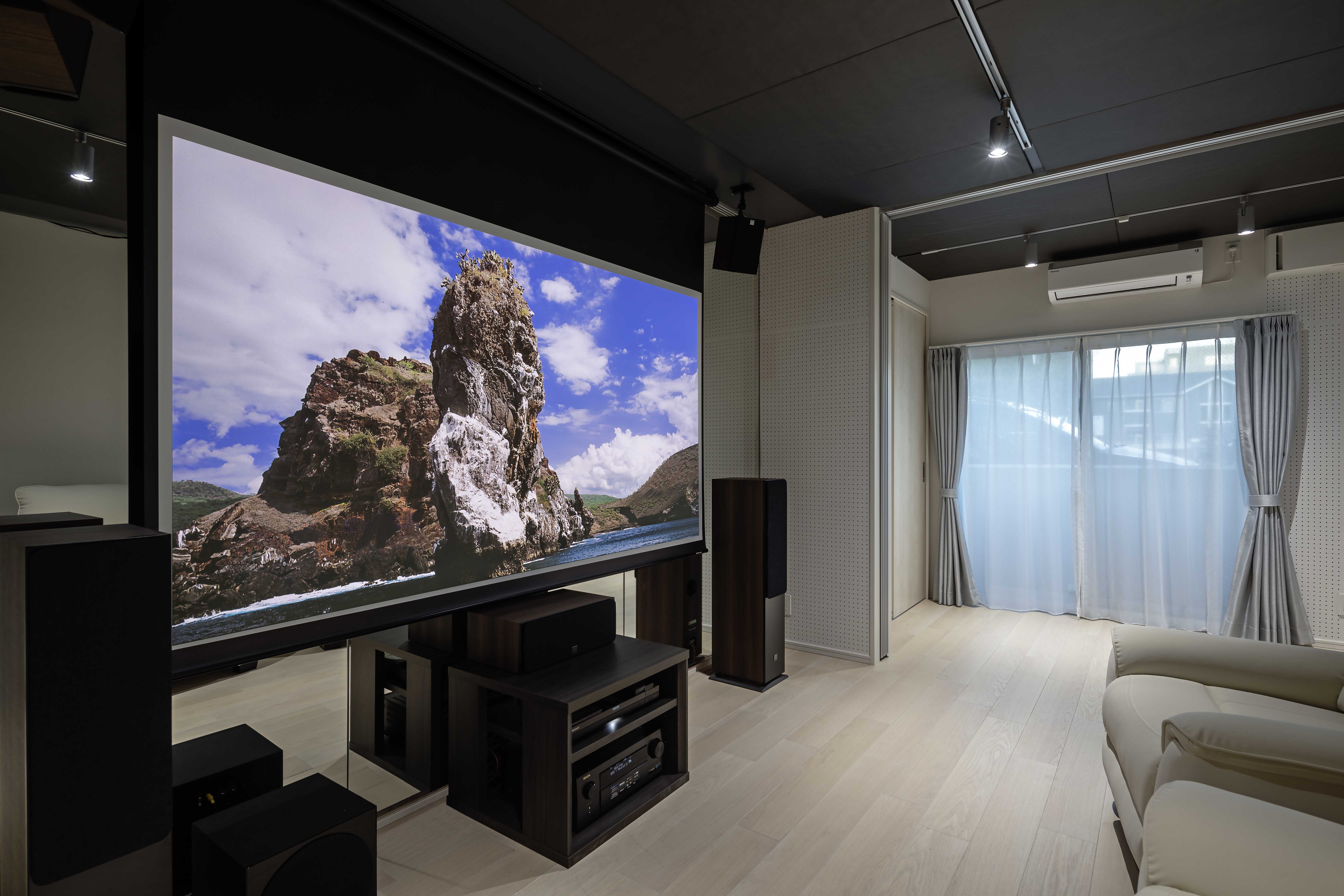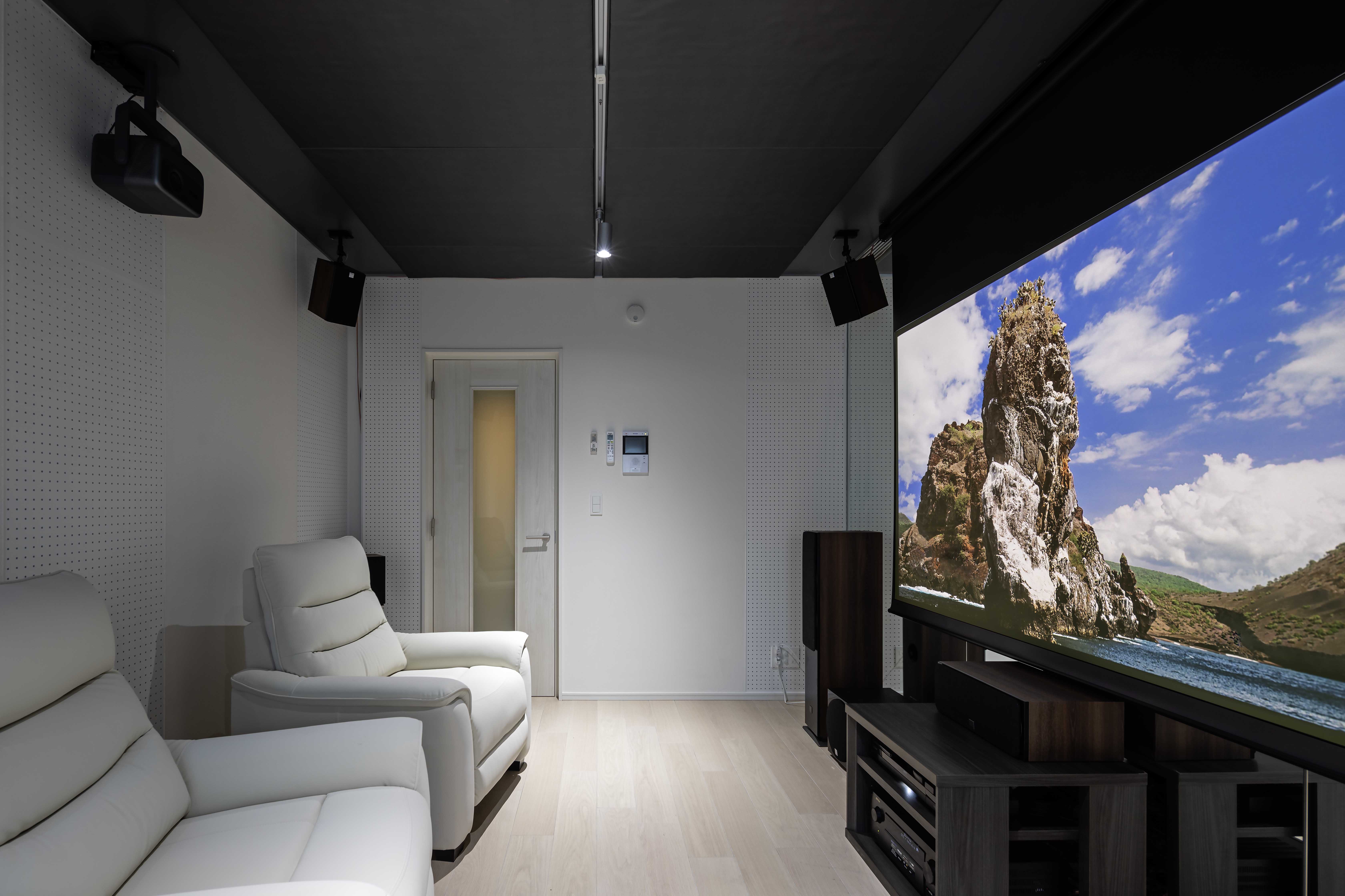 最新鋭の音響環境でホームシアターを楽しめる空間です。100インチスクリーン(4K対応電動昇降スクリーン)、 4Kトリプルレーザープロジェクター「JMGO N1S Ultra」のほか、デンマークのメーカー「DALI」製ハイエンドモデル「OBERON/OPTICON/シリーズ」や、DENON製ハイエンドAVアンプ「AVR-X4500H」(IMAX Enhanced対応)をはじめとしたアンプを天井4本、床6本(重低音1本含む)計10基設置し、360度全方位からの音響移動を実現させるDolbyAtmos 5.1.4ch(計9.1ch)を構成しています。
