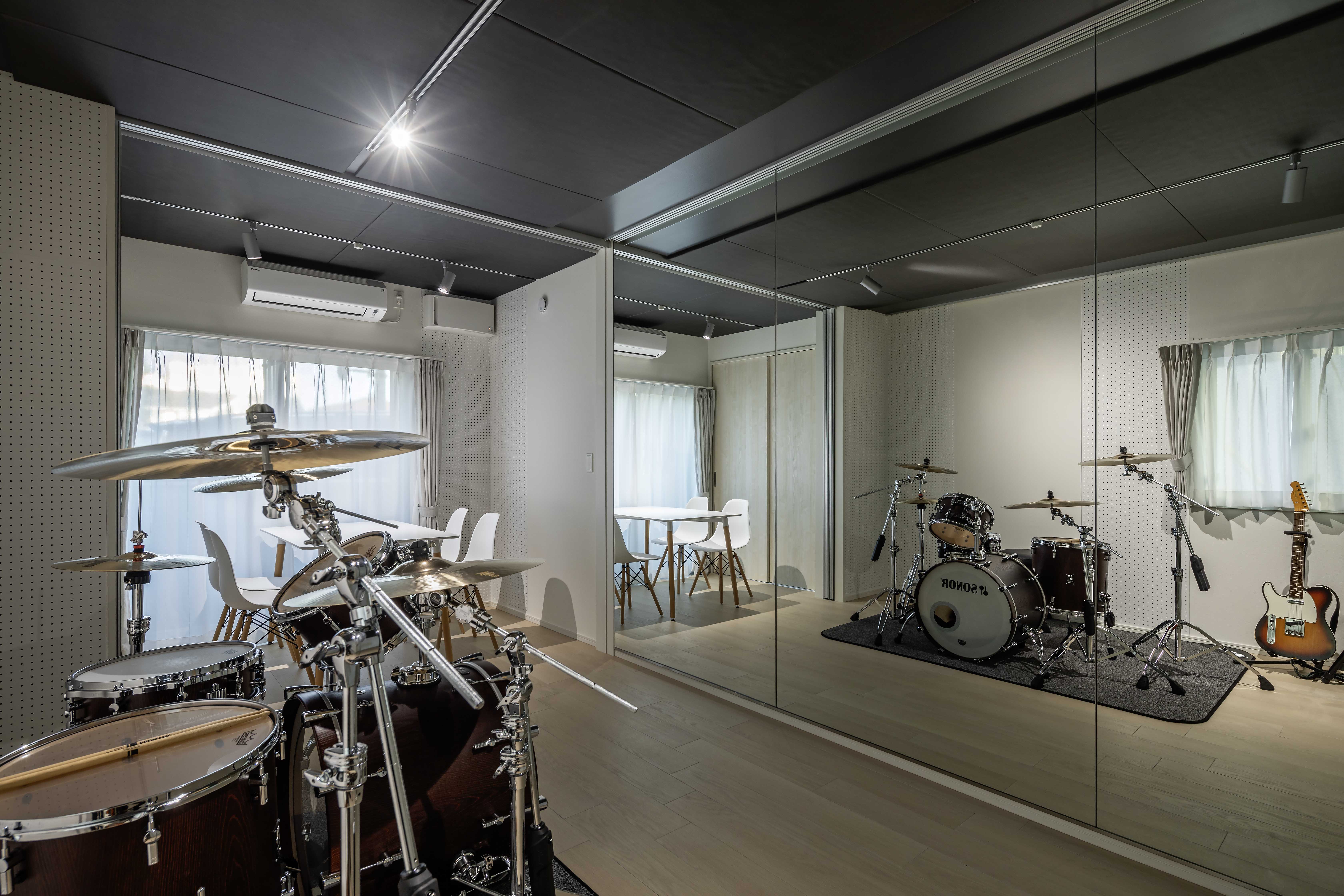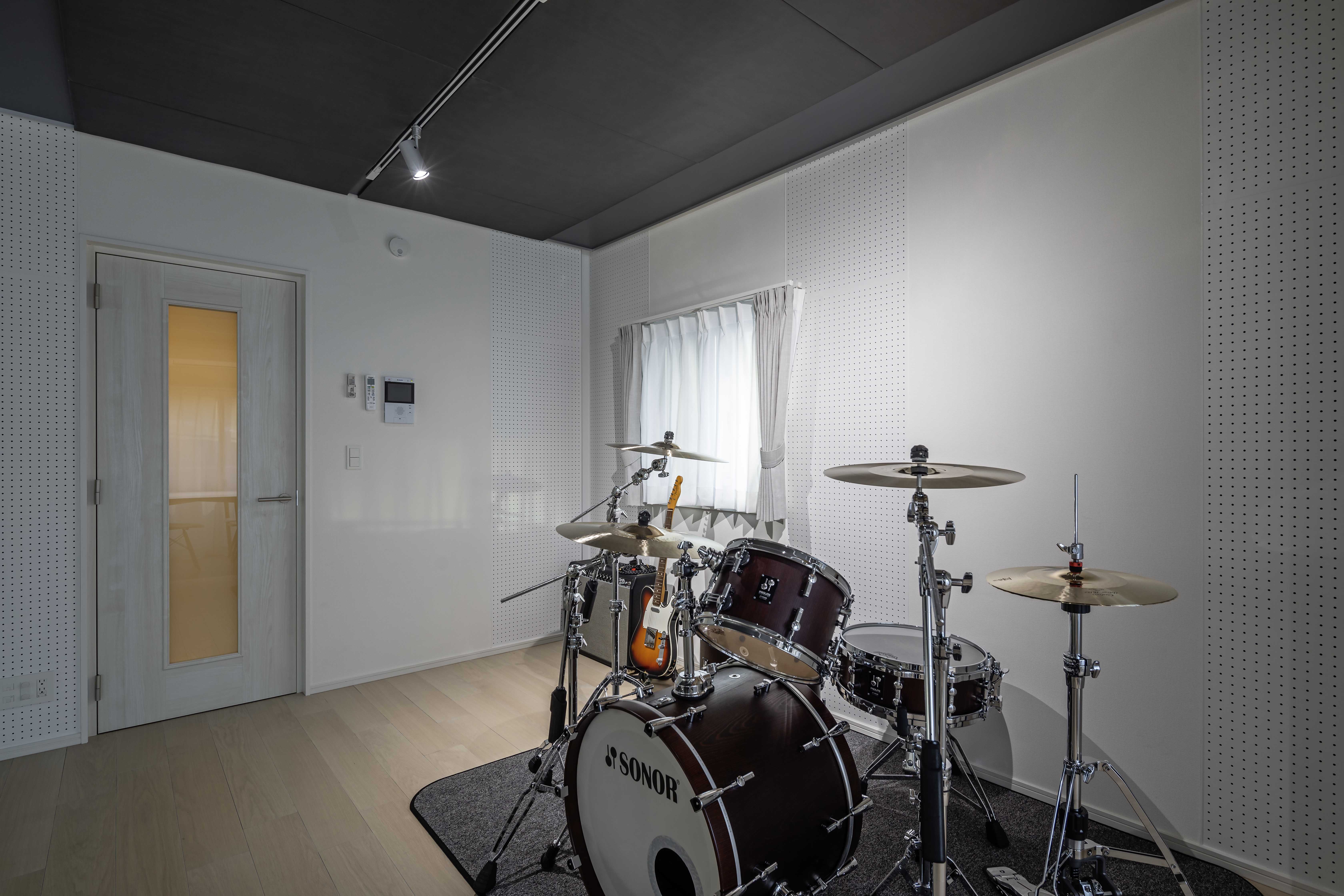 楽器演奏時の心地良さを体験できるモデルルームです。室内にご用意したドラムセット(SONOR Prolite Series)、ギターアンプ(Fender Twin Reverb)、エレキギター(Fender Telecaster)や、ご自身で持参された楽器で音を鳴らすことにより、どのように反響するかを肌で感じられます。また、演奏しながら隣室のリアルタイム映像をチェックし、ご自身の演奏音が本当に漏れていないかをご確認いただけます。
