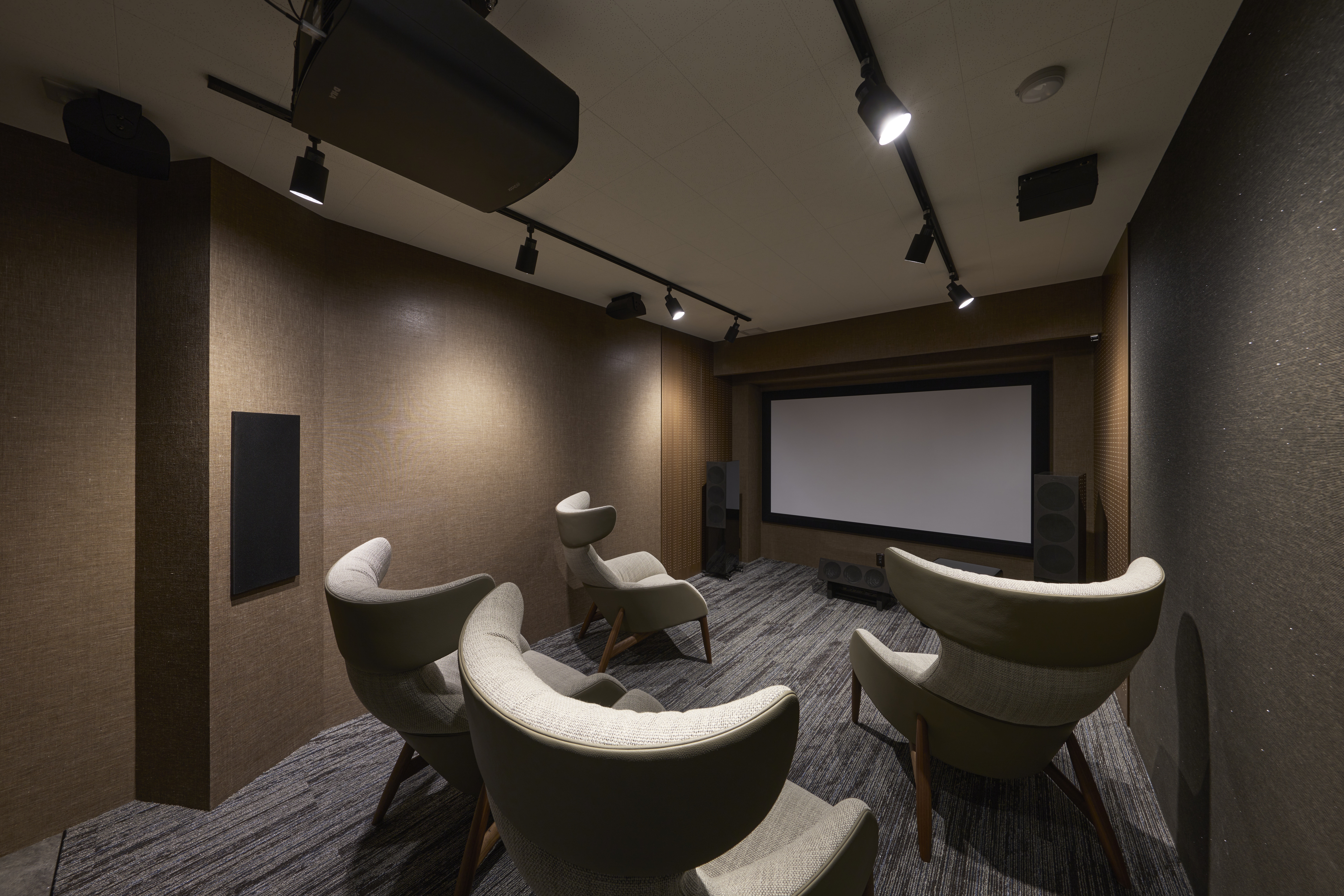 プロジェクターとスクリーンを備えた防音仕様のマルチスタジオでは、迫力あるサウンドで映画鑑賞が楽しめるほか、楽器演奏など趣味の時間にも活用できます。