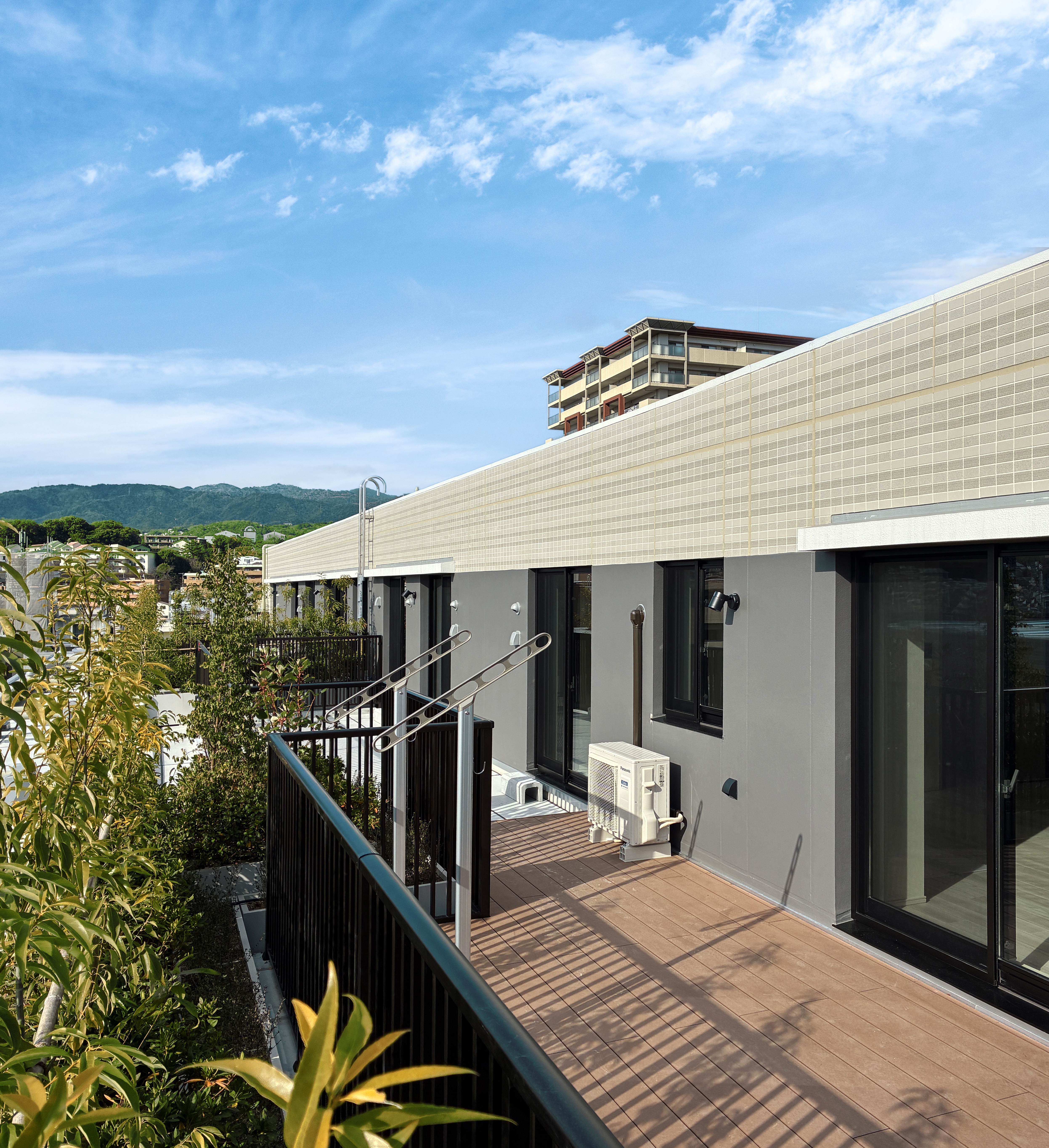 北棟の最上階は1フロア3邸としました。また、ルーフバルコニーの一部にはウッドデッキを敷いており、アウトドアリビングとしてもご利用いただけます。