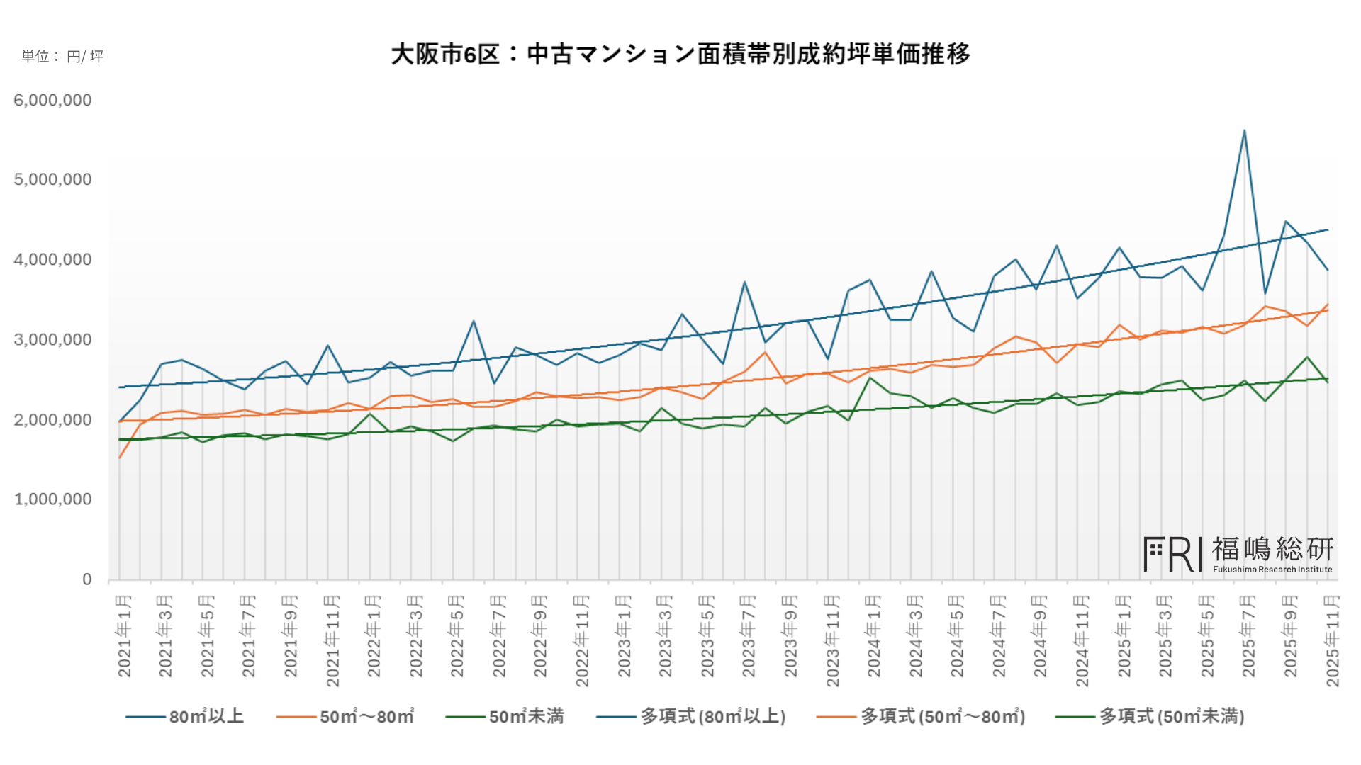 そのため市場に資金が流入すると、まず希少性の高い広面積帯から価格が押し上げられる構造が生まれます。東京都心部では顕著に確認されてきましたが、大阪市6 区の都心部でも同様の兆候が見え始めています。