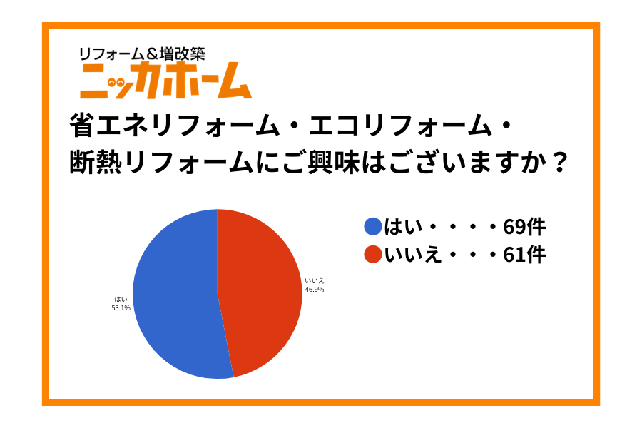 「省エネリフォーム・エコリフォーム・断熱リフォームにご興味はございますか?」という質問では、53.1%が「はい」と回答。