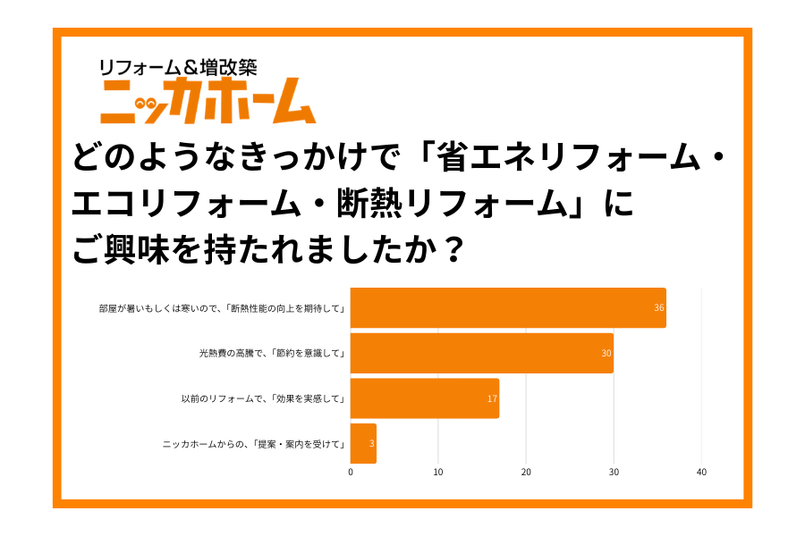 アンケートの結果から、生活の快適性だけでなく、光熱費削減といった観点からもリフォームの関心が高まっていることがうかがえます。
