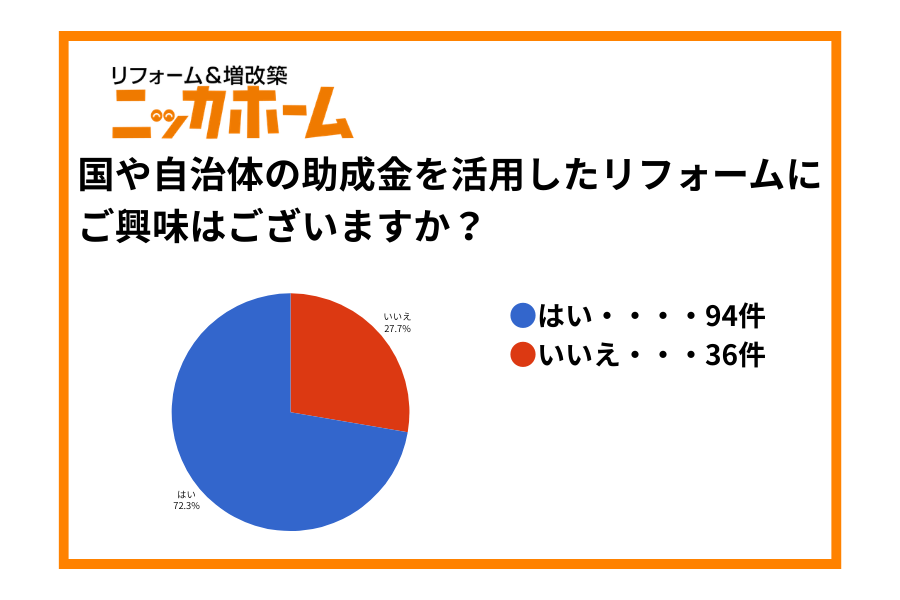 同アンケートでは、「国や自治体の助成金を活用したリフォームにご興味はございますか?」という質問に対し、72.3%が「はい」と回答しました。