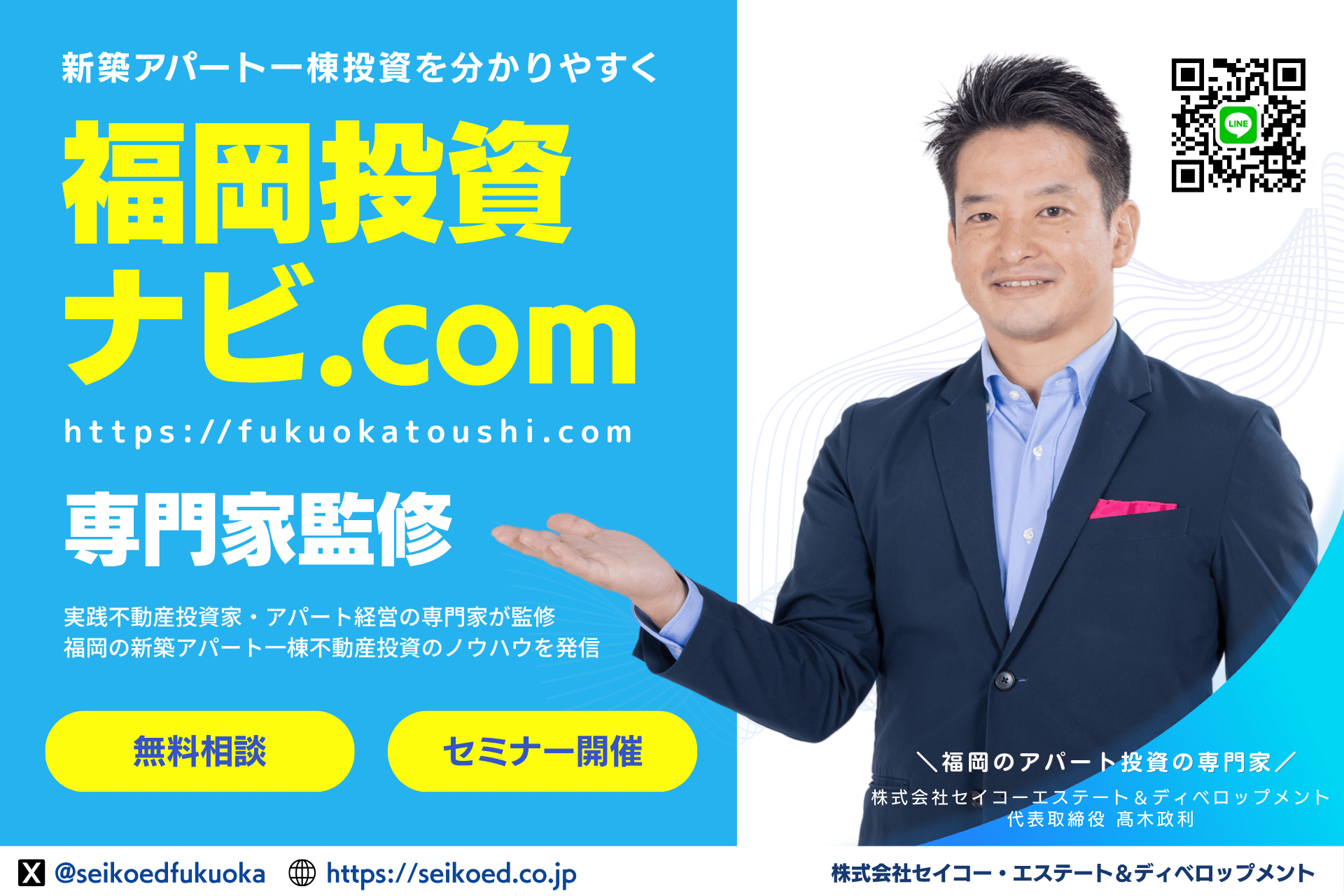 株式会社セイコー・エステート&ディベロップメントは、福岡市博多区を拠点に不動産投資支援と建築事業を展開しています。土地仕入れから融資戦略、建築プラン、施工、入居者管理までをワンストップで提供し、投資家の資産形成を伴走型で支援することを理念としています。本気でFIREを目指す投資家のために、福岡エリアでの不動産投資において、「投資家目線に立ったアパート建築会社」として、多くの投資家から高い信頼をいただいております。