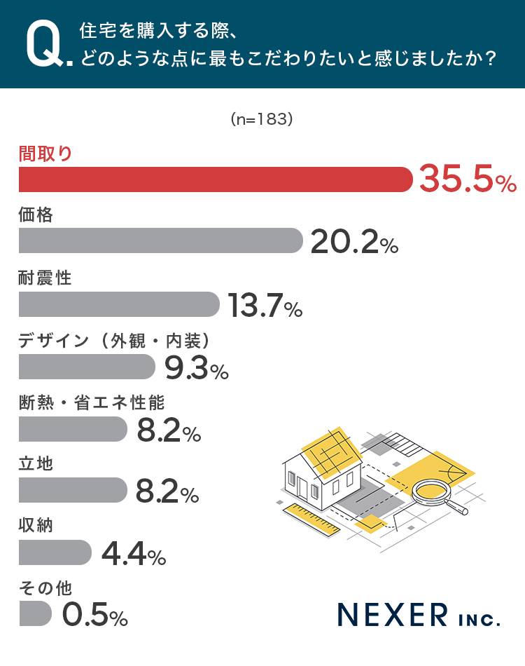 その結果「間取り」が35.5%で最多となりました。次いで「価格」が20.2%、「耐震性」が13.7%と続いています。
