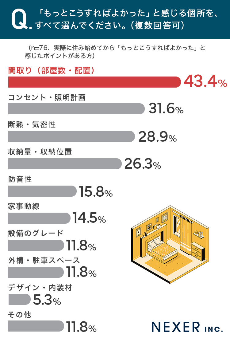 その結果、1位は「間取り(部屋数・配置)」で43.4%でした。2位は「コンセント・照明計画」で31.6%、3位は「断熱・気密性」で28.9%、4位は「収納量・収納位置」で26.3%となっています。