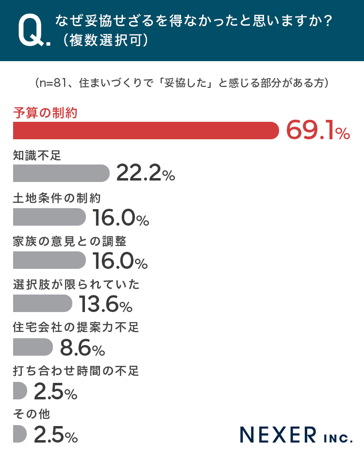 その結果、圧倒的に多かったのが「予算の制約」で69.1%でした。次いで「知識不足」が22.2%、「土地条件の制約」と「家族の意見との調整」がそれぞれ16.0%、「選択肢が限られていた」が13.6%となっています。