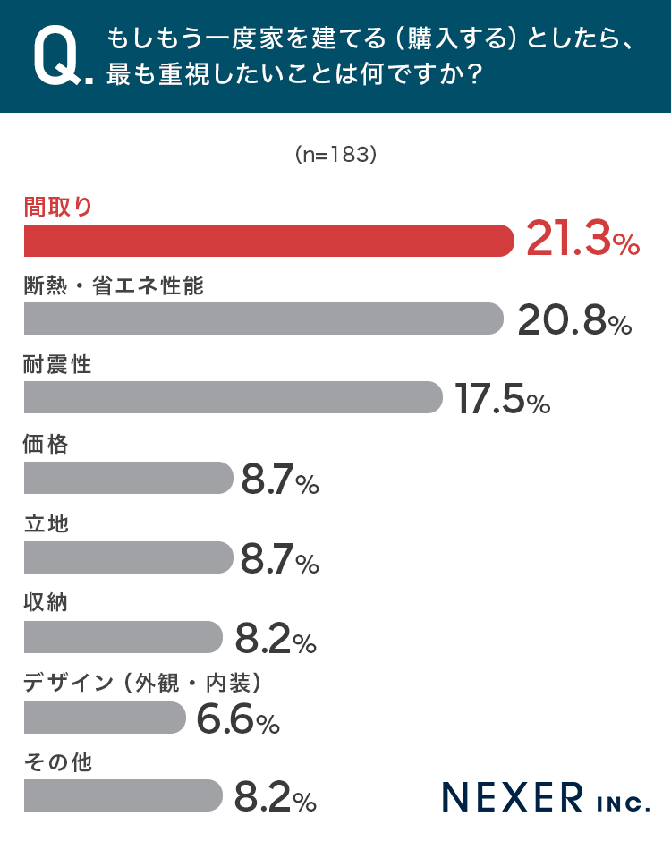 1位は「間取り」で21.3%、僅差の2位が「断熱・省エネ性能」で20.8%、3位は「耐震性」で17.5%でした。「価格」と「立地」がそれぞれ8.7%、「収納」が8.2%、「デザイン(外観・内装)」が6.6%と続きます。