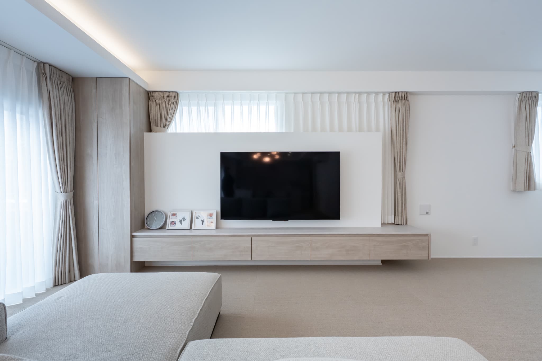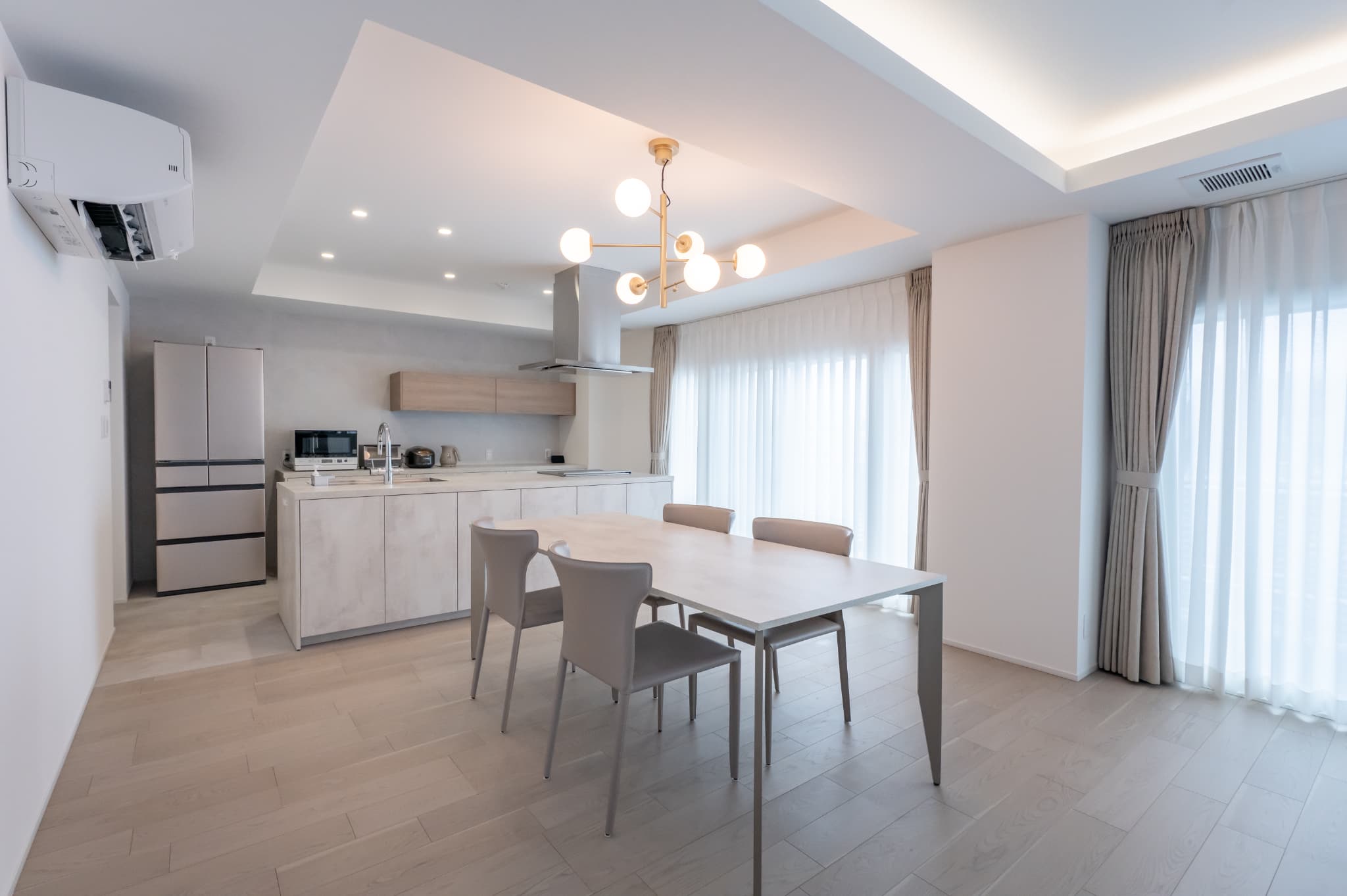 全体をグレートーンで統一しつつ、光の演出で空間に表情を加えました。構造上残る梁は、間接照明を仕込むことで折り上げ天井のようにアレンジ。窓一面にかけたレースカーテンが、やわらかな光を取り込みます。真鍮のアクセントや木の質感を重ね、冷たくなりすぎない上質なホテルライク空間に仕上げました。