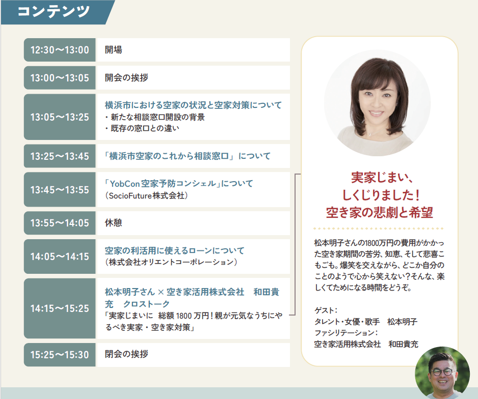 特別ゲストとして、タレント・女優・歌手の松本明子さんをお迎えし、空き家問題解決の専門家である和田貴充(弊社取締役)と「実家じまいに総額1800万円!親が元気なうちにやるべき実家・空き家対策」と題したクロストークを実施。楽しくて為になる松本さんの実体験は必聴です!