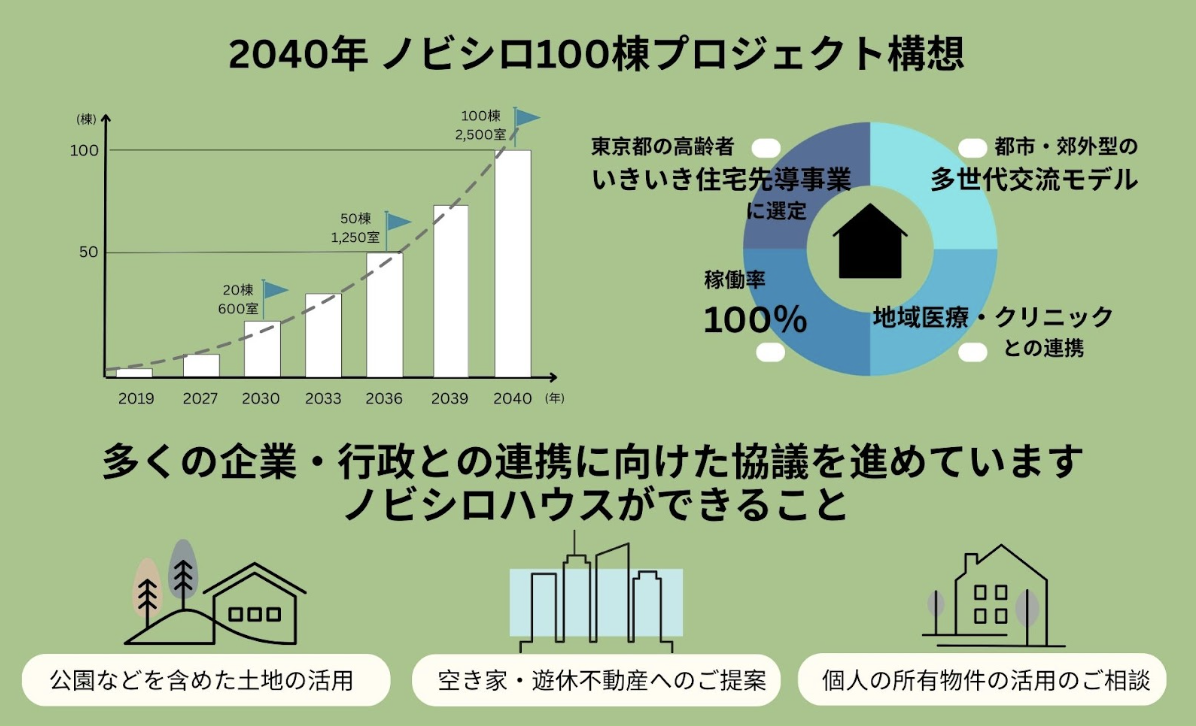 今後は、今回開設する「ノビシロハウス東久留米」に続き、当社は2040年に向けて100棟の展開を目指してまいります。高齢化が進む日本社会において、多世代が交流しながら互いに支え合える新しい住まいの形を、より多くの地域へ広げていくことを目指します。