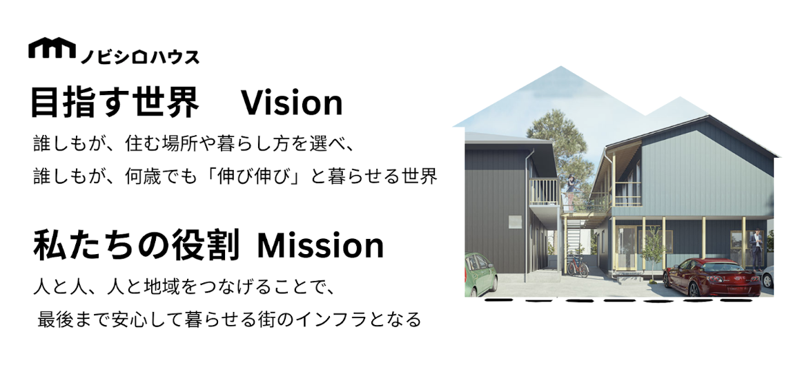 ノビシロハウスは、「高齢になるとお金があっても家が借りられない」という社会課題を解決するべく、株式会社ノビシロが「最後まで暮らせる賃貸住宅」を提供することで、人と人、人と地域をつなげ、最後まで安心して暮らせる街のインフラとなることを目指した高齢者向け住宅事業です。