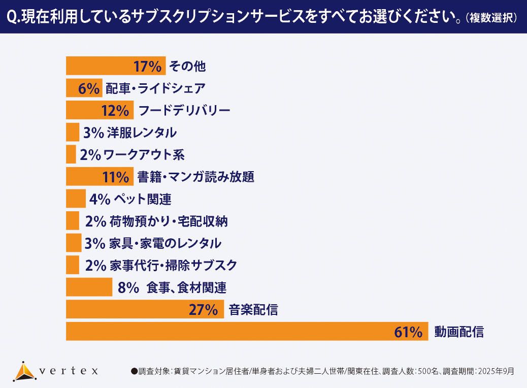 株式会社ベルテックス(所在地:東京都新宿区、代表取締役:梶尾 祐司)は、近年多様な付帯サービス導入で競争が激化する賃貸マンション市場を背景に、おもに首都圏の賃貸マンションに居住する単身者および夫婦二人世帯に対し、サブスクリプションサービスに関する意識調査を実施しました。