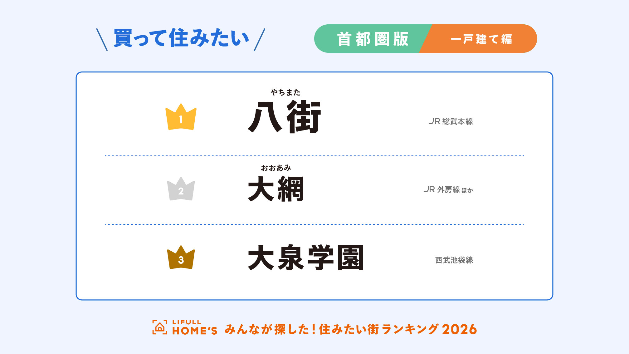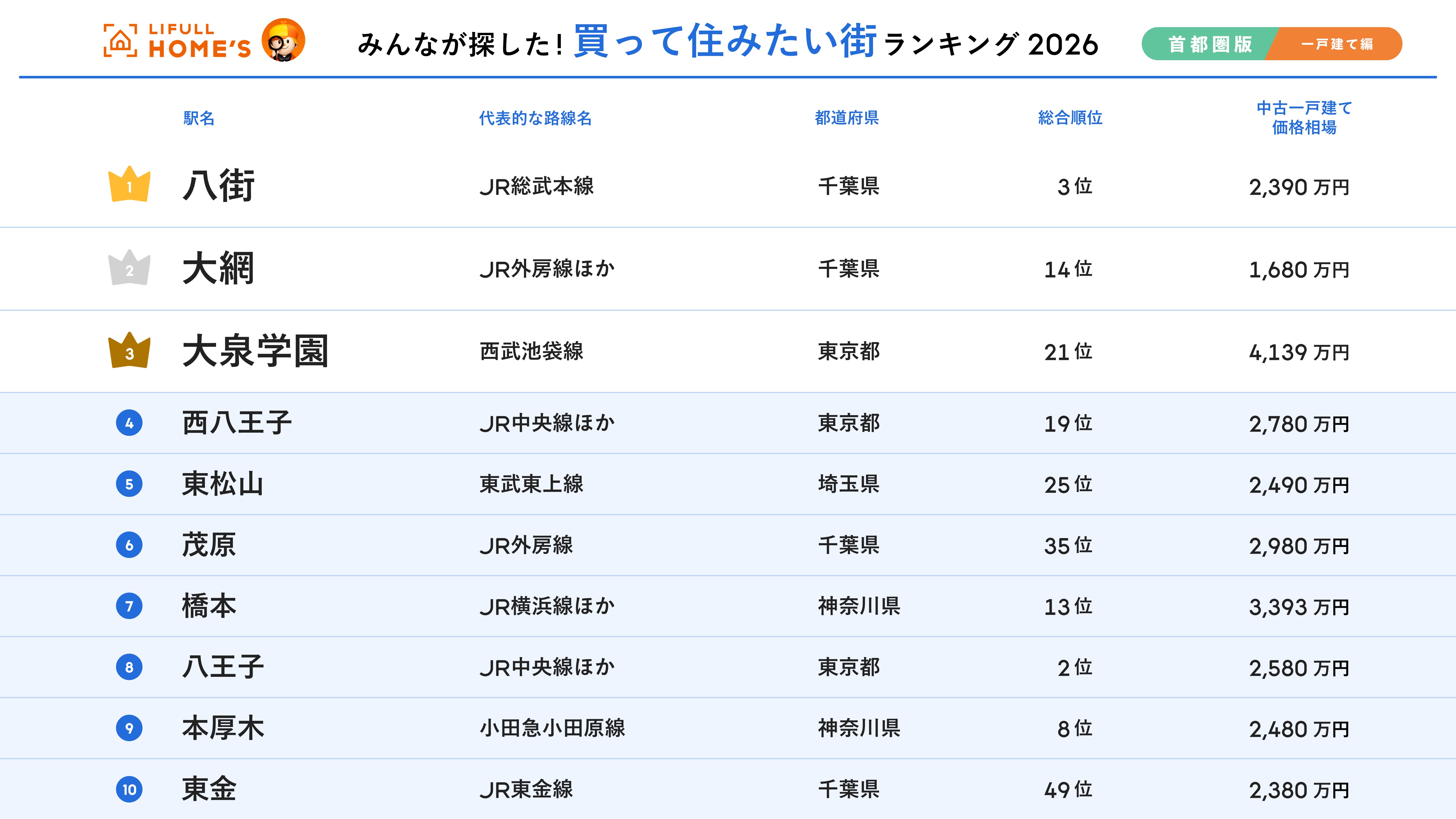 事業を通して社会課題解決に取り組む、株式会社LIFULL(本社:東京都千代田区、代表取締役社長:伊東祐司、東証プライム:2120)が運営する不動産・住宅情報サービス「LIFULL HOME’S(ライフルホームズ)」は、首都圏の「買って住みたい街」について、一戸建てのみを集計した「2026年 LIFULL HOME’S みんなが探した!買って住みたい街ランキング(首都圏版・一戸建て購入編)」を初めて発表します。