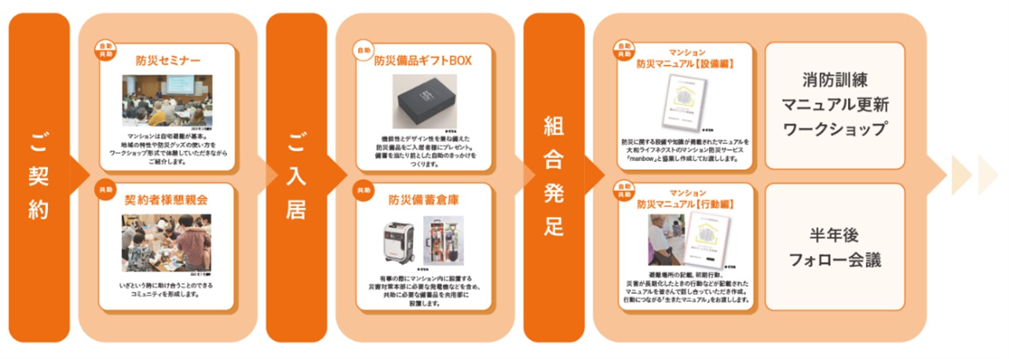 例えば、入居前の懇親会やワークショップ形式の防災セミナーや避難訓練、防災マニュアルを住民自ら作成することで各マンションの入居者の声を反映した「マンション防災マニュアル作成会議」などを行い、“自助”“共助”が自然と根付く環境づくりを後押ししています。