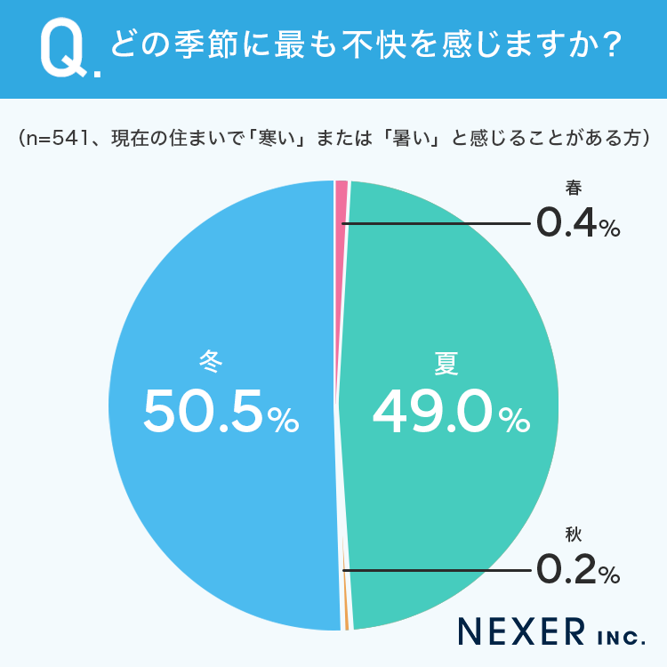 結果は「冬」が50.5%、「夏」が49.0%とほぼ同数でした。春や秋と回答した方は1%未満にとどまり、やはり寒暖差の激しい夏と冬に多くの方が不快を感じていることがわかります。