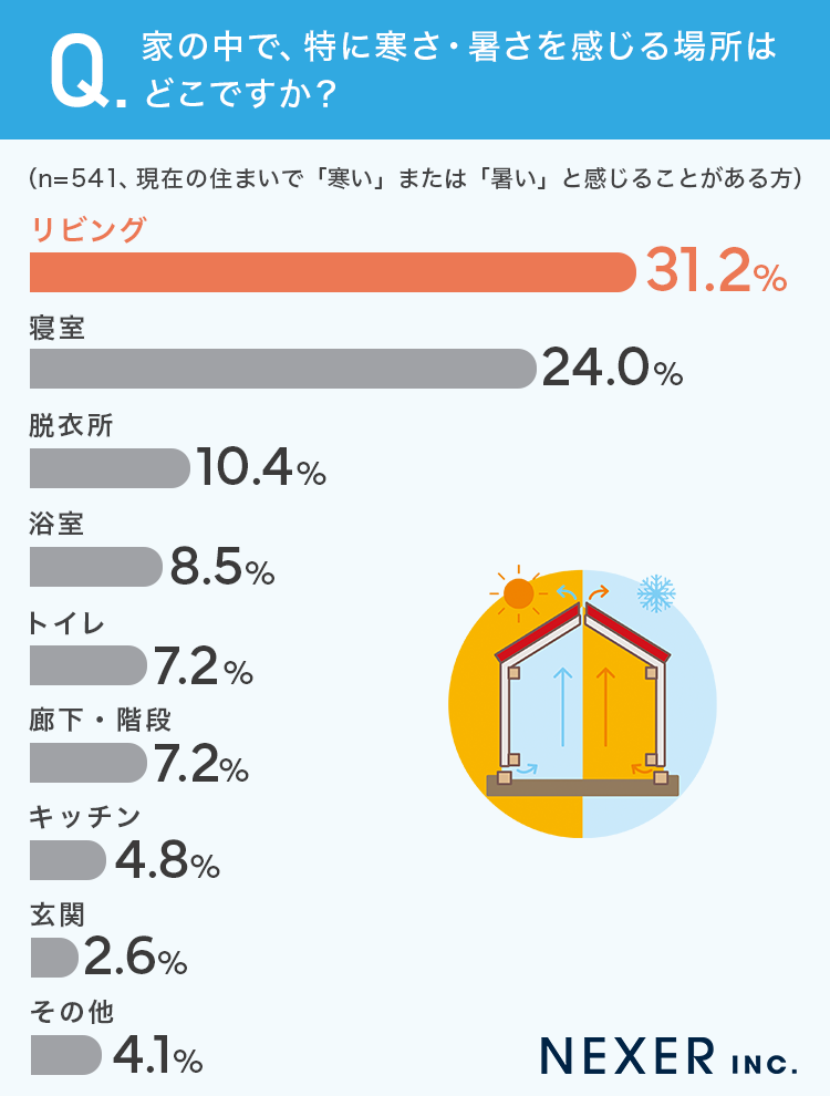 最も多かったのは「リビング」で31.2%、次いで「寝室」が24.0%、「脱衣所」が10.4%という結果になりました。長時間過ごすことの多いリビングや寝室、そして入浴前後に裸になる脱衣所で、温度のストレスを感じている方が多いことがうかがえます。
