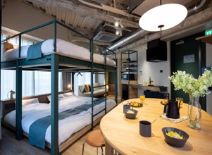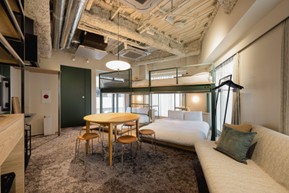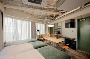 客室は、全室5名以上が利用可能な都心部には少ないグループ・ファミリー向けの客室設計です。また滞在型のアパートメントホテルとして、全部屋にキッチン、ドラム式洗濯乾燥機が完備されています。
