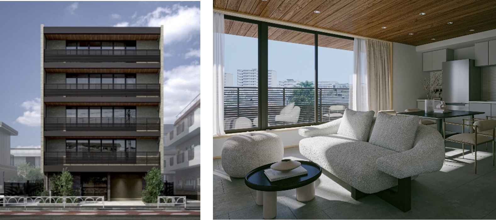 本物件は、周辺の緑豊かな環境や閑静な住宅街に自然に溶け込むよう、落ち着いた色調にアクセントを加えた外装デザインを目指しました。内観には、開放的なリビング空間をはじめ、多様なしつらえを取り入れ、入居者一人ひとりの「自分らしさ」を引き立てる暮らしを実現しています。