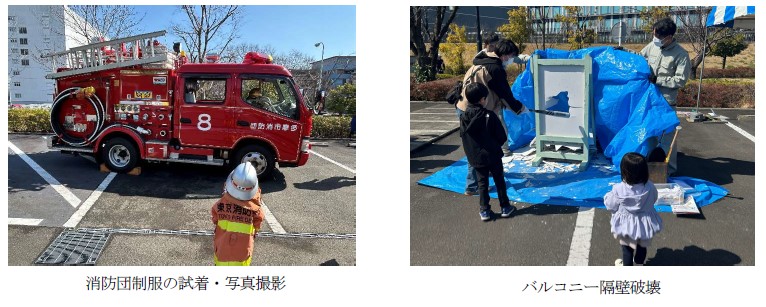【体験イベント】ポンプ車による放水、起震車、煙ハウス、応急救護、バルコニー隔壁破壊、