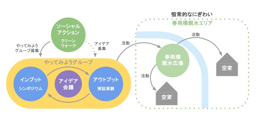 恒常的な賑わいを創出していくためには、積極的に活動するまちの担い手となる「まちの主役」を集めていくことが重要であると考えました。そこで、エリア内の春雨橋親水広場を活用して「まちの主役」を集め、それぞれのやりたい企画を実施し、活動の自立を促す仕組みの構築と、意見交換やアイデアなどを共有しあうコミュニティ「やってみようグループ」を中心に、広場やまちに関わる人々が主体的に活動できる場を創出することで、地域と「まちの主役」とを繋げ、地域に新しい交流や活動の循環を生み出してきました。
