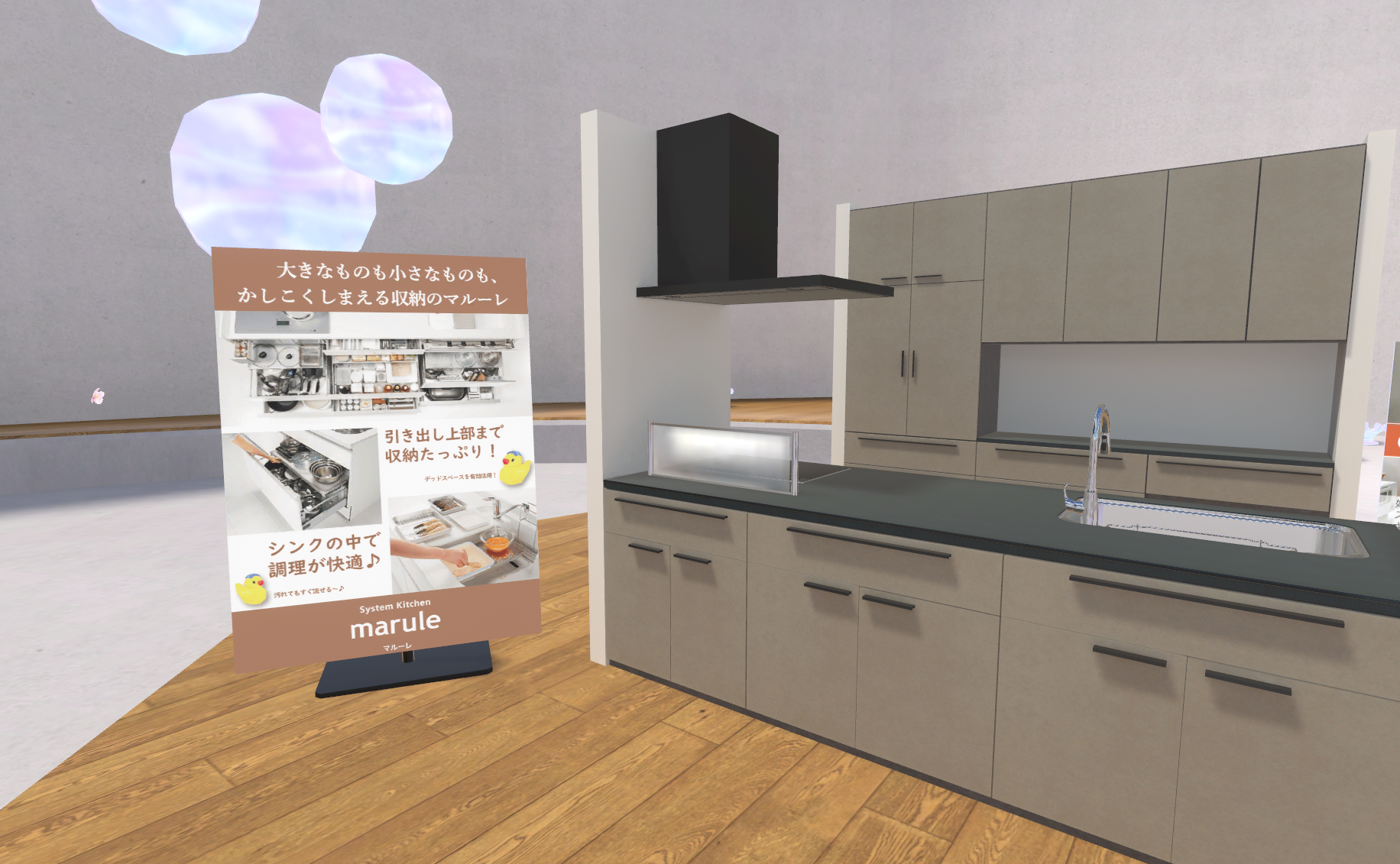 豊富な収納力と上質な高級感を演出するデザインバリエーションで人気のシステムキッチン「マルーレ」をクラフトアイテム化しました。シンク・調理台・コンロに3分割して配布いたします。3つのクラフトアイテムをすべてコンプリートすると自分だけのキッチンを完成させることができる体験型特典です。