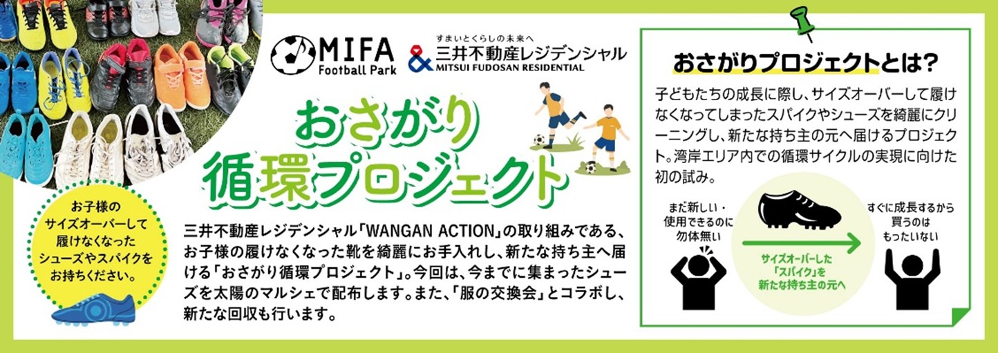 今回、三井不動産レジデンシャル株式会社と株式会社MIFAが手掛ける「おさがりプロジェクト」、ならびに株式会社ワンピースが手掛ける「服の交換会」の2つの取り組みがコラボレーションし、「WANGAN ACTION循環プロジェクト」と題して、不要になった服・靴の交換会を実施します。誰かの手放した服や靴を通した人と人との繋がりやコミュニティの形成を通じて、湾岸エリア内での新たな循環サイクルの実現を目指します。