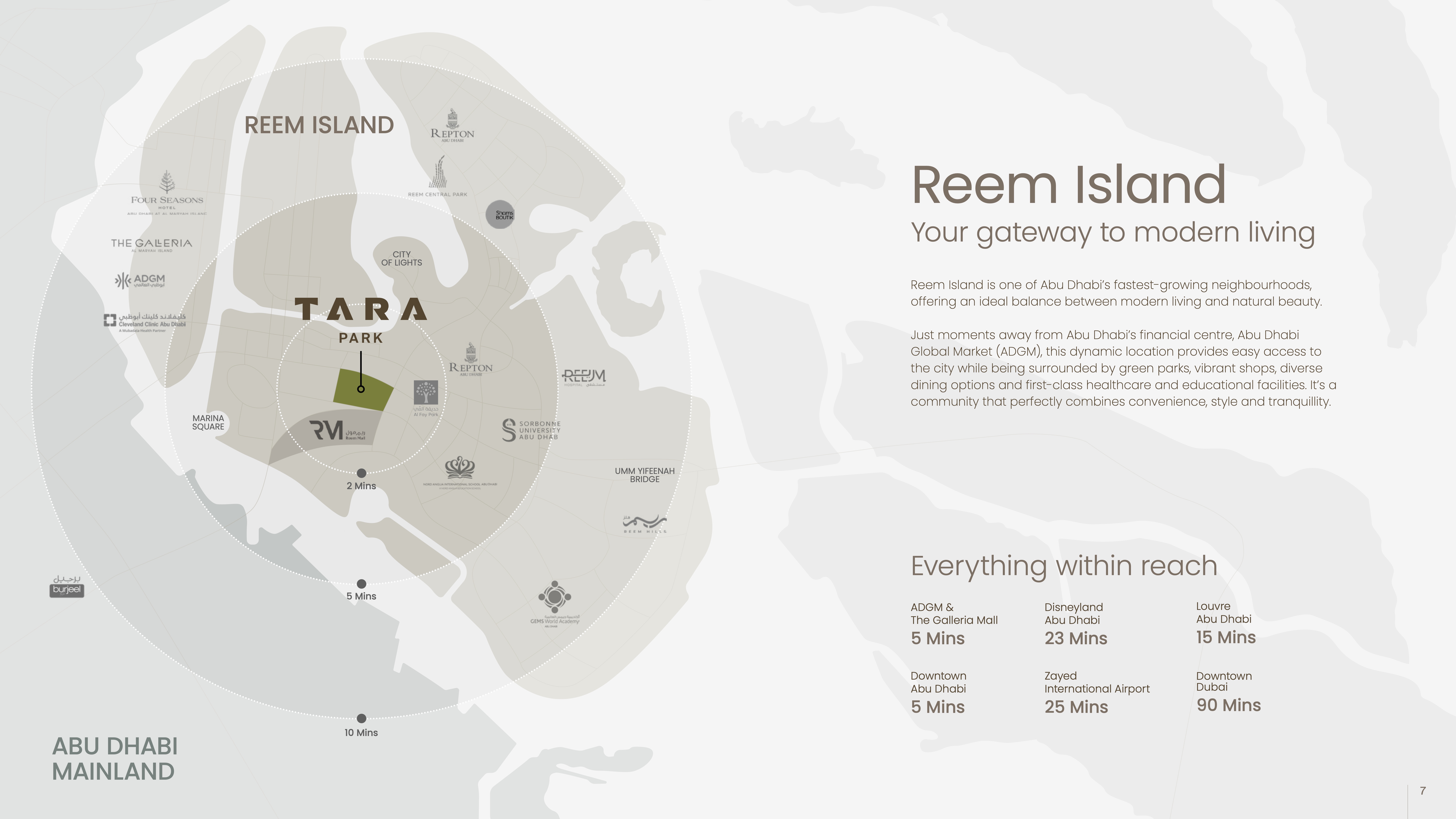 Tara Parkは、リームモールの正面に位置し、ショッピングやレストランを日常使いしやすい利便性の高いロケーションが魅力です。周辺には、Al Fay Park、Sorbonne University、Repton Schoolなどもそろっており、生活・教育・レジャーのバランスが取れた住環境が整っています。