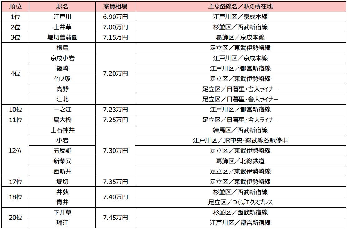ホーム調査レポート東京23区の家賃相場の安い駅ランキング2026 1位の江戸川駅は6万円台、最多ランクインは足立区の駅