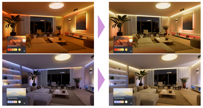 近日リリース予定。これまでプリセットシーンは、シーン内の色をランダムにHueライトに割り当てていました(画像左)が、アプリでHueライトの位置情報を読み込むことで、室内を統一感のあるグラデーション(画像右)で表現が可能となり、より快適な空間をつくります。