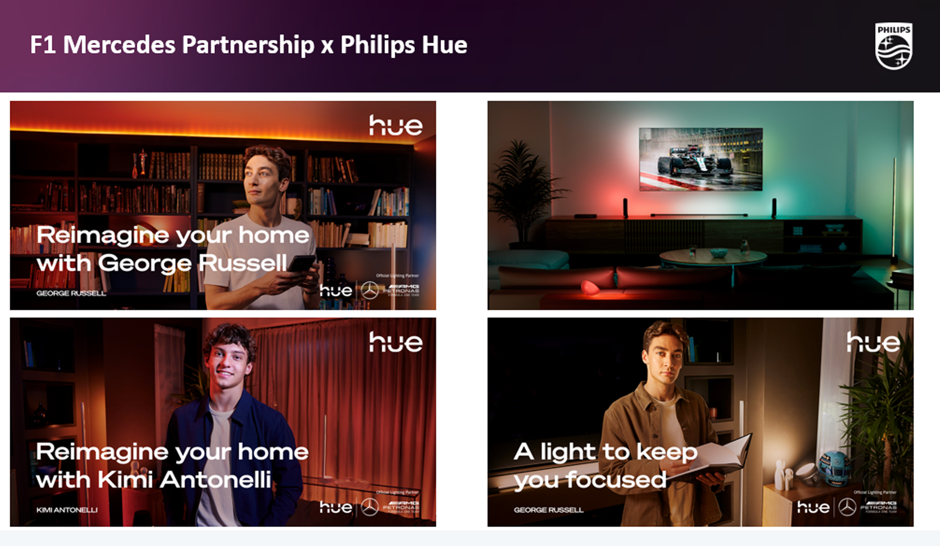 F1「メルセデス AMG ペトロナス F1 チーム」とのパートナーシップにより、世界各国でレースに臨む選手たちの時差ボケ解消にHueの明かりを活用するなど、明かりの面からチームをサポートしています。