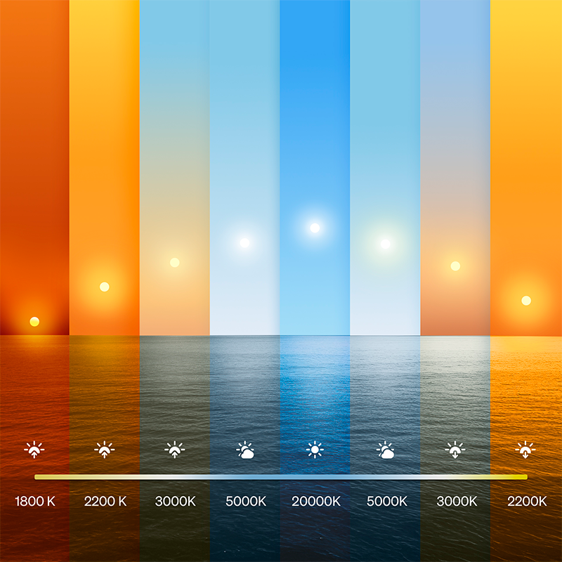 また、白色光が従来製品の2000~6500Kから1000~20000Kへとフルスペクトル対応となり、夕暮れのような深い朱色から、抜けるような青空の色まで再現が可能となりました。E26電球は2025年秋に発売を開始し、E17電球は2026年夏に発売を予定しております。