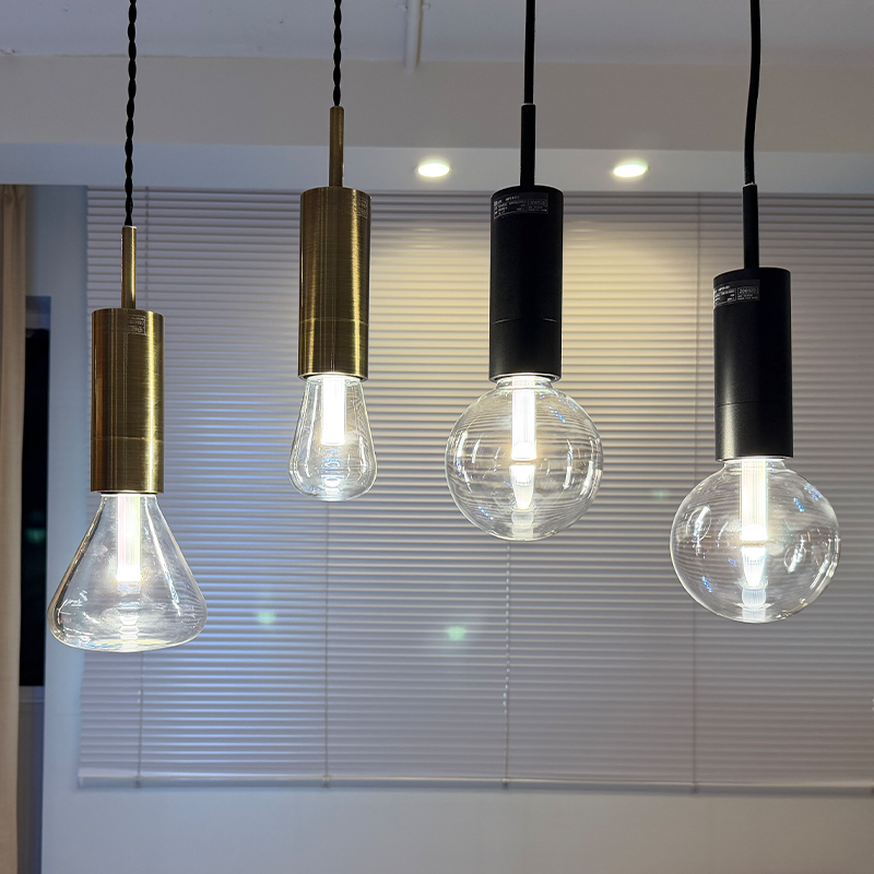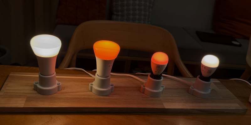 イベントでは、新旧モデルを最小ケルビンと最大ケルビンで点灯し、光の表現の違いを体感いただきました。【左より、旧E26電球/新E26電球/新E17電球/旧E17電球】