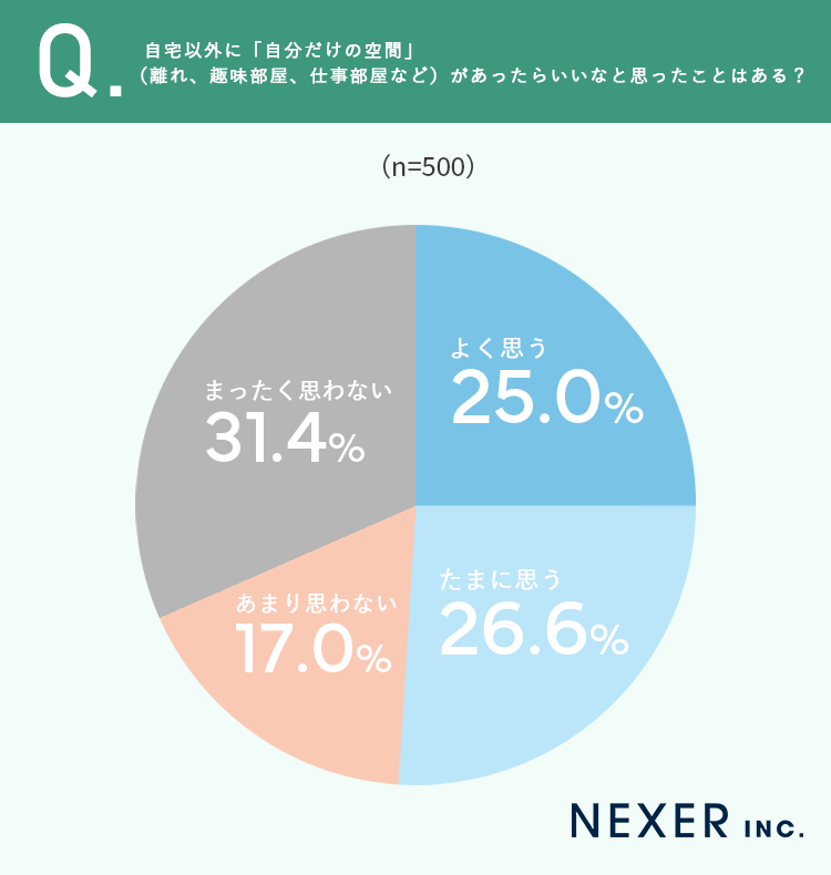 まず、自宅以外に「自分だけの空間」があったらいいなと思ったことがあるかについて聞いてみました。