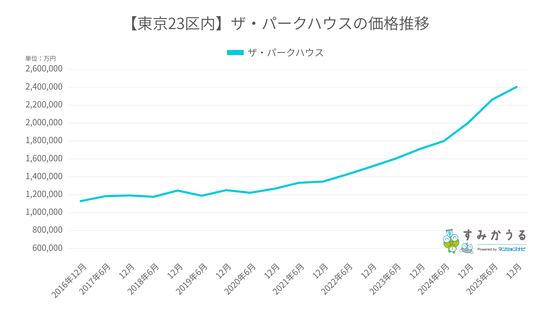マンションナビの独自データによると、「ザ・パークハウス」の平均平米単価は2016年12月から2025年12月にかけて右肩上がりで推移し、約2.1倍(約112%増)の高騰を記録しました。
