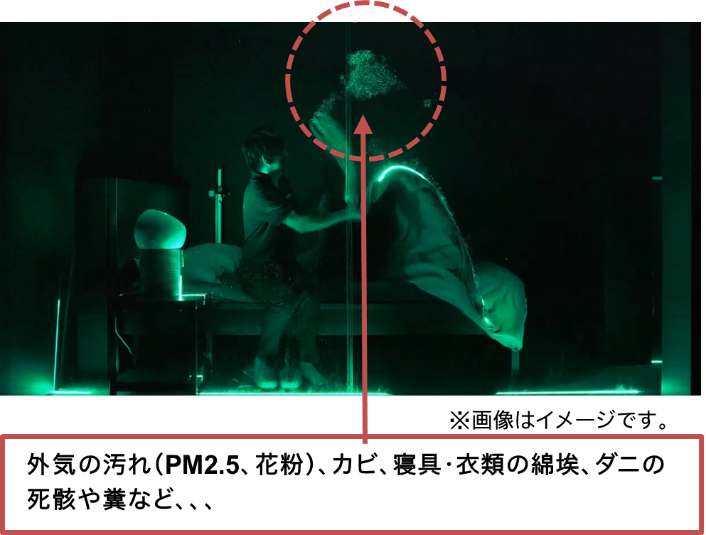 これらの微粒子が寝室内に滞留して空気が汚れると、就寝中の鼻づまりを引き起こし、無意識のうちに呼吸が浅くなる要因になると考えられています。